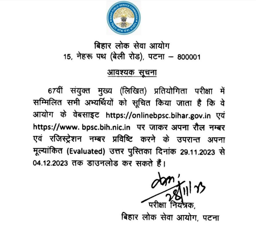 BPSC has released a notification for those candidates who appeared in the 67th main descriptive Examination. BPSC already declared the final merit list for the selective candidate, but for some reason, those students who failed the exam can check their answer copy on the official website of BPSC link is given below. Answer Books will be available on the dashboard from 29th November to 4th December 2023.